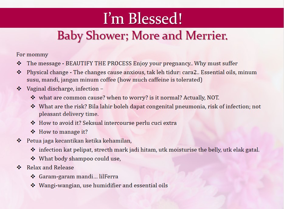 Masa semakin suntuk, bayi dalam kandungan semakin hari semakin membesar. Oleh itu, jangan sia-siakan peluang ini dan jangan berlengah lagi, tawaran Lil’ Fierra Antenatal Class ini hanya terhad kepada 20 couple (husband/wife) yang terawal sahaja tau!